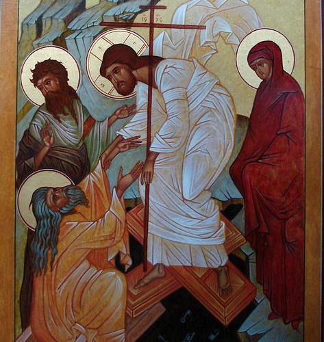 I began to meet with the artist and go through drawings several weeks ago. The tattoo is inspired by an icon of the Harrowing of Hell that was written by Wayne Hajos. In the icon, Jesus is standing on the broken gates of Hell and pulling Adam out of his tomb by his wrist. John the Baptist stands by and points the way to Christ, even in Hell.